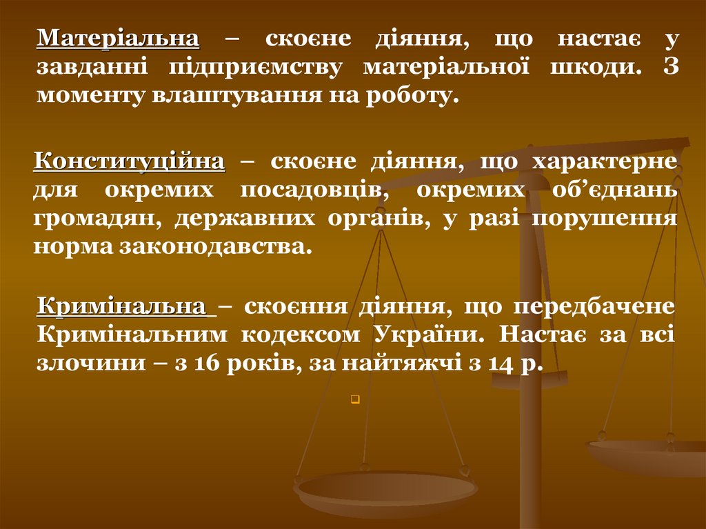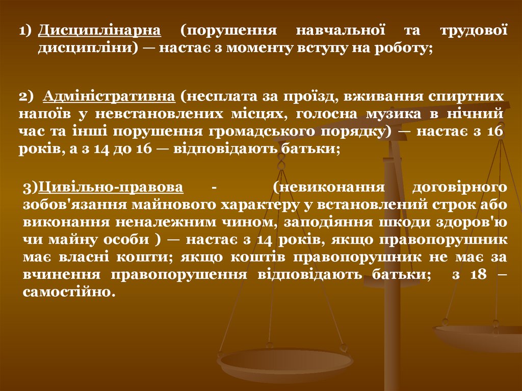 1) Дисциплінарна (порушення навчальної та трудовоїдисципліни) — настає з моменту вступу на роботу;