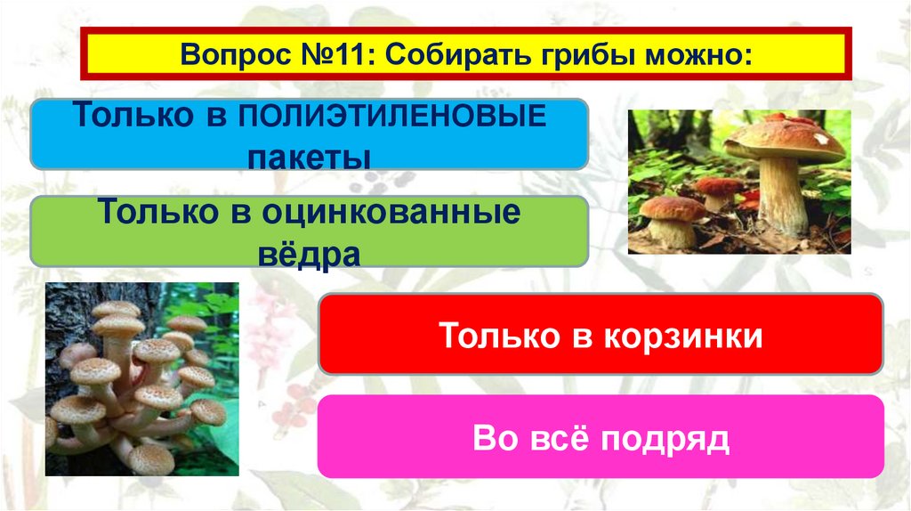 Вопрос №11: Собирать грибы можно:Только в ПОЛИЭТИЛЕНОВЫЕ