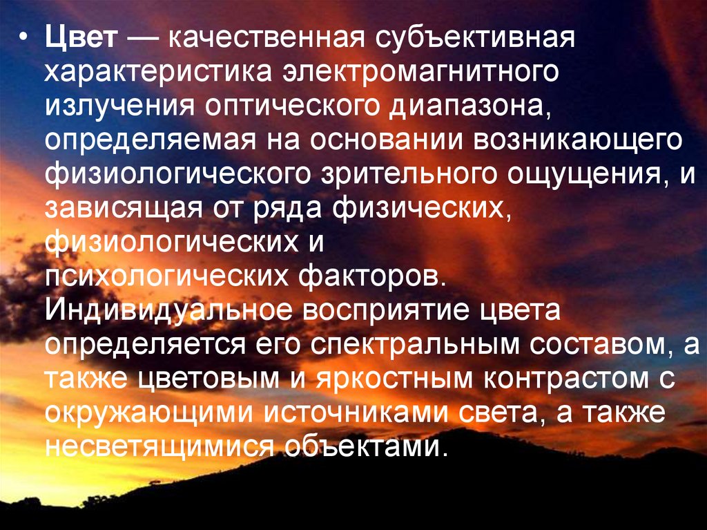 • Цвет — качественная субъективнаяхарактеристика электромагнитного
