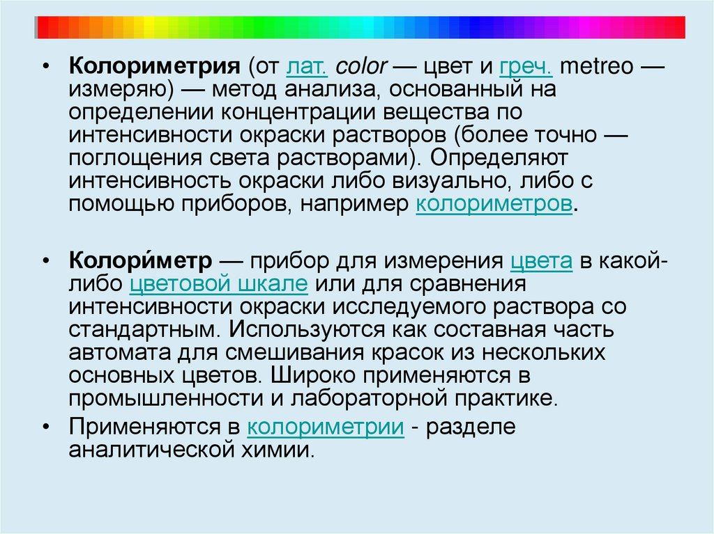 • Колориметрия (от лат. color — цвет и греч. metreo —измеряю) — метод анализа, основанный на