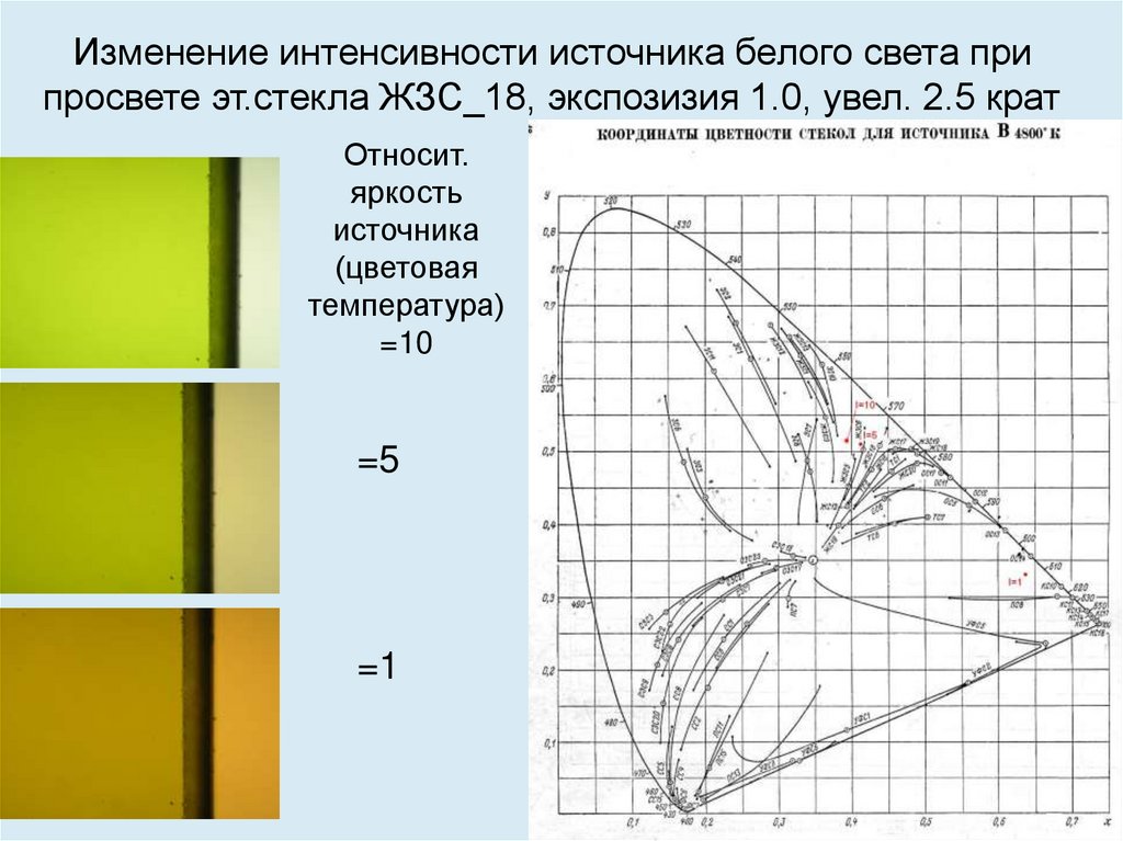 Изменение интенсивности источника белого света припросвете эт.стекла ЖЗС_18, экспозизия 1.0, увел. 2.5 крат