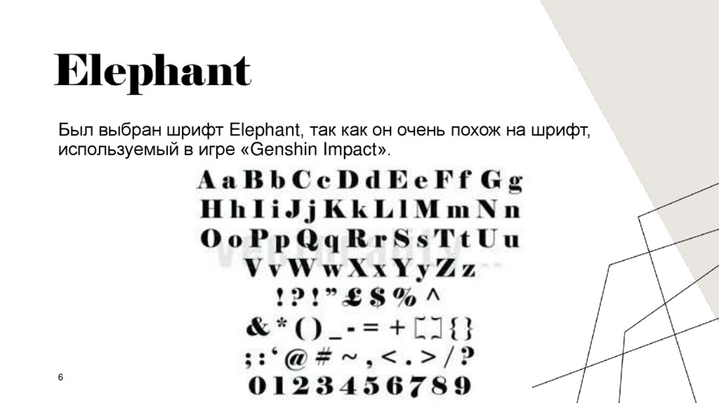 Был выбран шрифт Elephant, так как он очень похож на шрифт,используемый в игре «Genshin Impact».