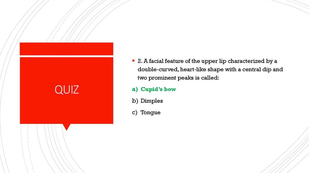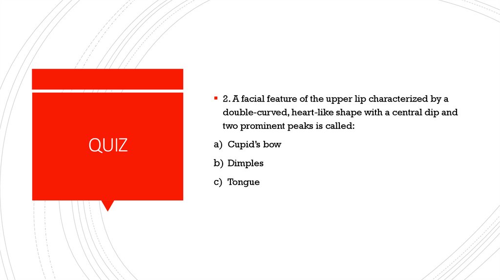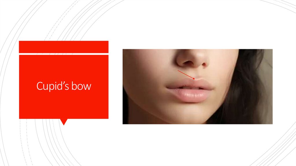 2. A facial feature of the upper lip characterized by adouble-curved, heart-like shape with a central dip and