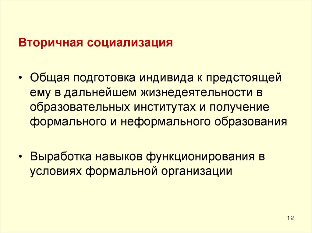 Вторичная социализация• Общая подготовка индивида к предстоящей