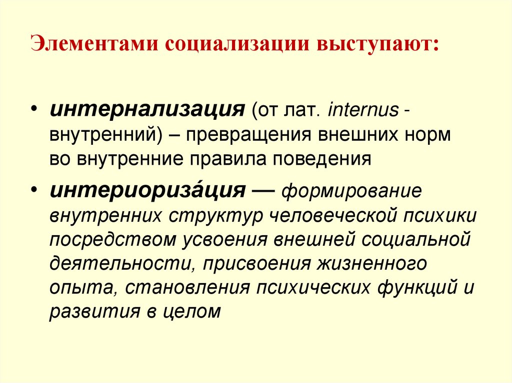 Элементами социализации выступают:• интернализация (от лат. internus внутренний) – превращения внешних норм