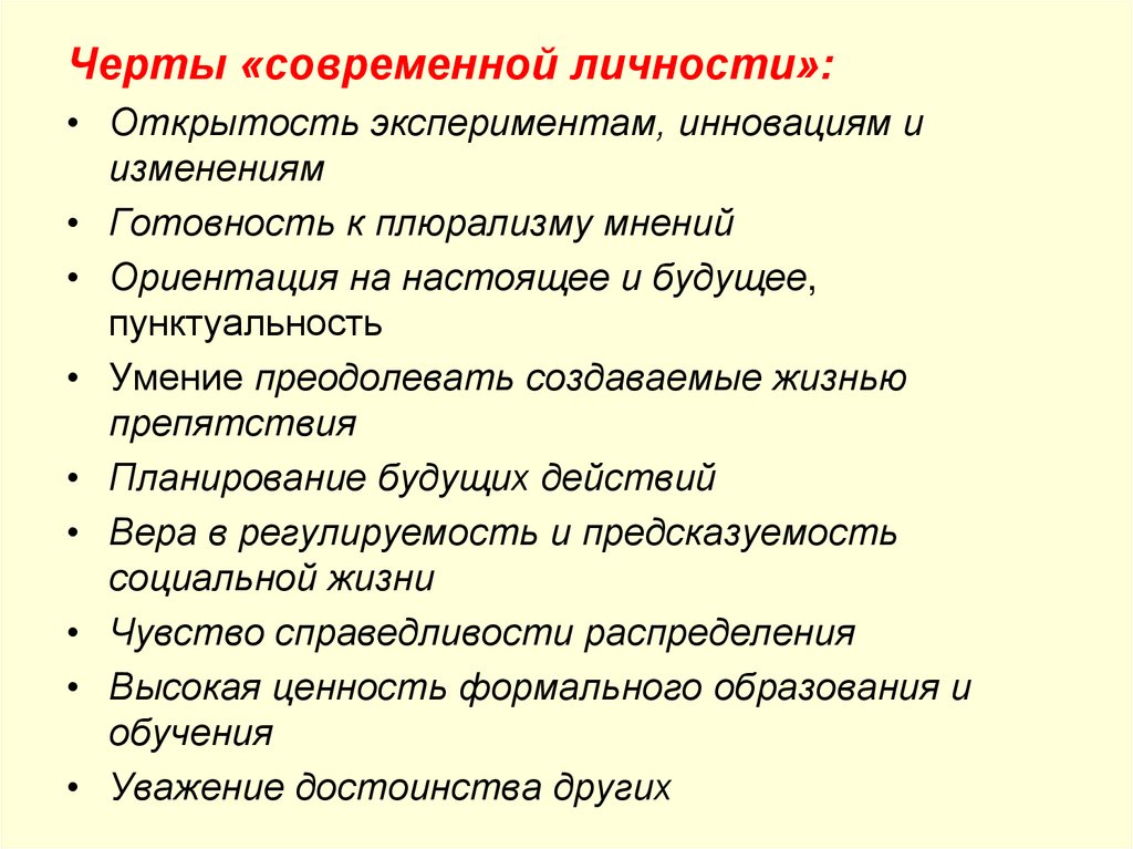 Черты «современной личности»:• Открытость экспериментам, инновациям и