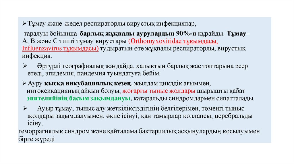 Тұмау және жедел респираторлы вирустық инфекциялар,таралуы бойынша барлық жұқпалы аурулардың 90%-н құрайды. Тұмау–