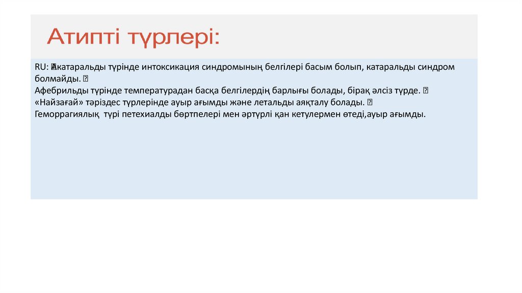 RU: Акатаральды түрінде интоксикация синдромының белгілері басым болып, катаральды синдром