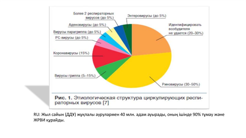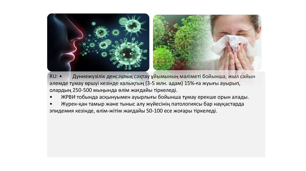 RU: Жыл сайын (ДДҰ) жұқпалы аурулармен 40 млн. адам ауырады, оның ішінде 90% тұмау жәнеЖРВИ құрайды.