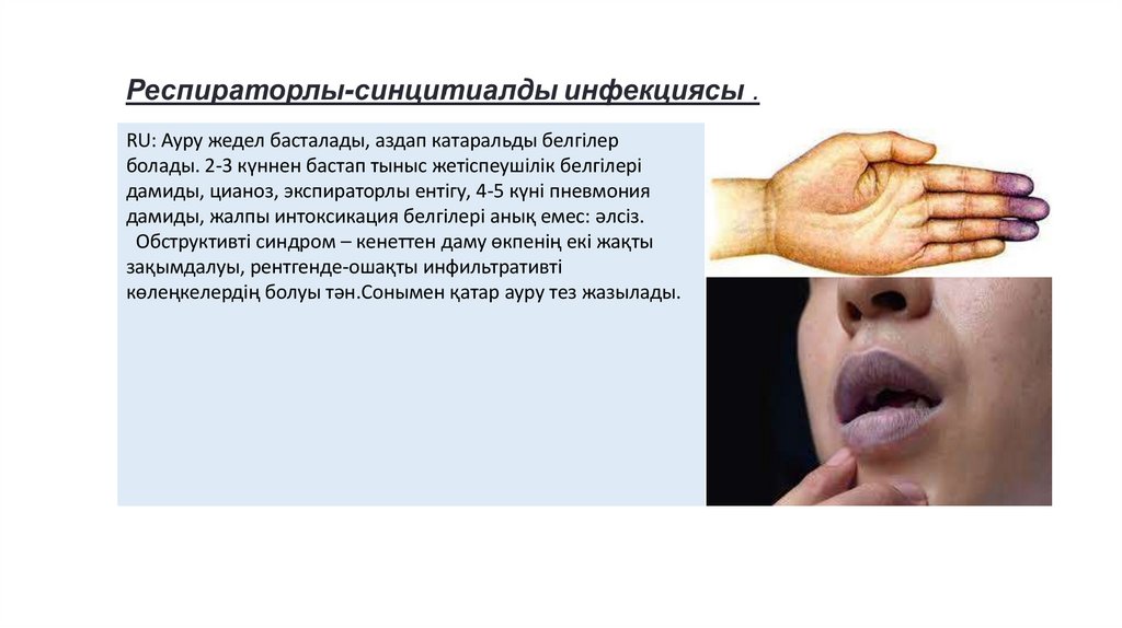 RU: Ауру жедел басталады, аздап катаральды белгілерболады. 2-3 күннен бастап тыныс жетіспеушілік белгілері