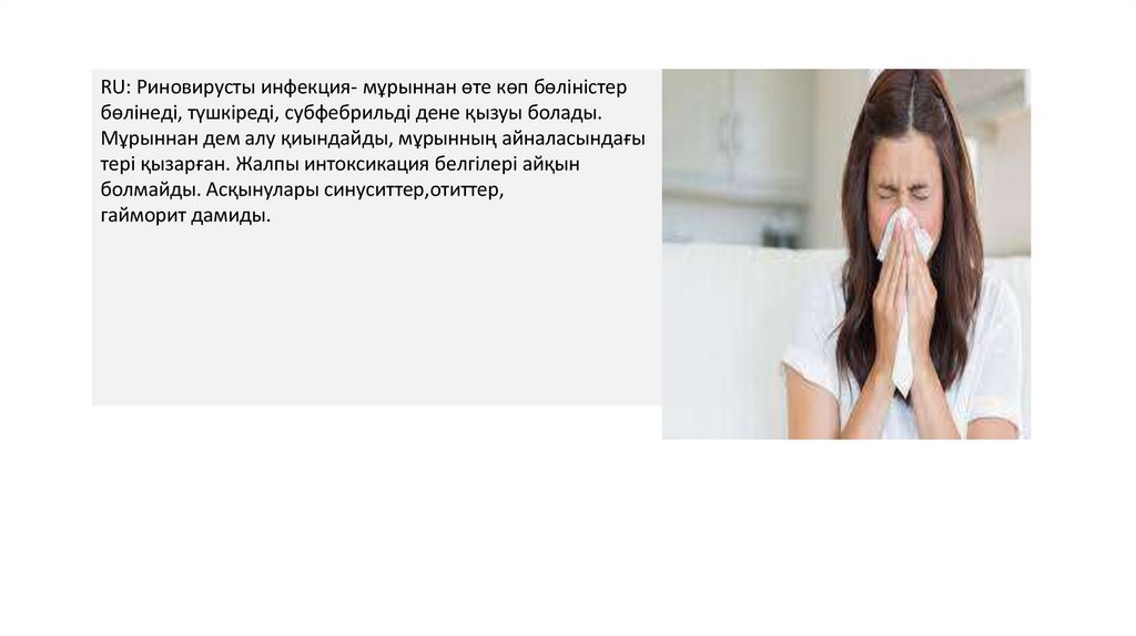 RU: Риновирусты инфекция- мұрыннан өте көп бөліністербөлінеді, түшкіреді, субфебрильді дене қызуы болады.