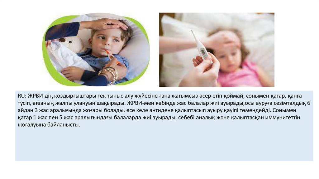 RU: ЖРВИ-дің қоздырғыштары тек тыныс алу жүйесіне ғана жағымсыз әсер етіп қоймай, сонымен қатар, қанғатүсіп, ағзаның жалпы улануын шақырады. ЖРВИ-мен көбінде жас балалар жиі ауырады,осы ауруға сезімталдық 6