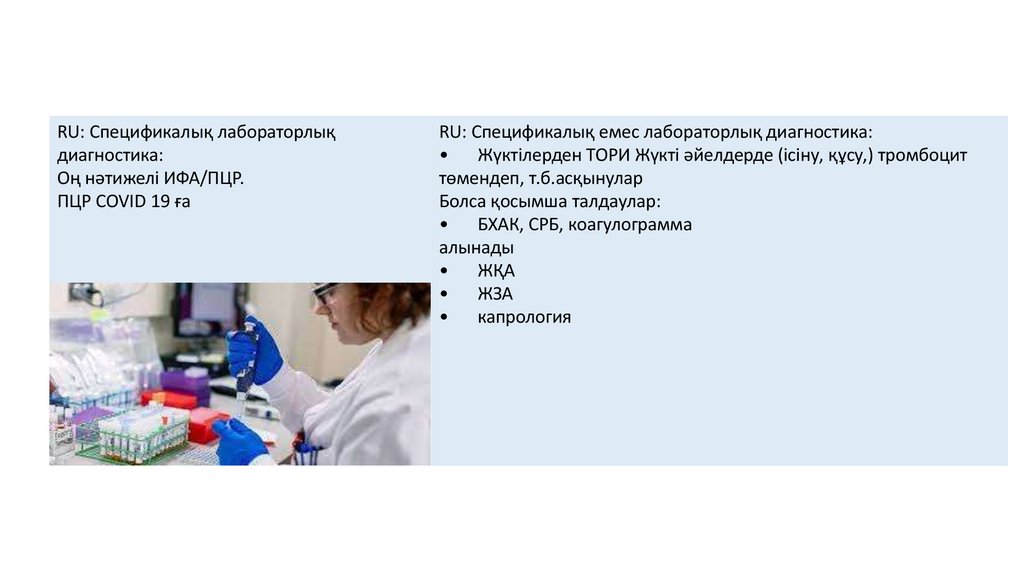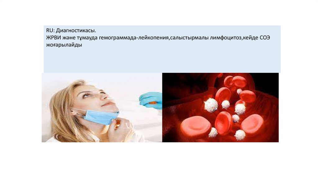 RU: Диагностикасы.ЖРВИ және тұмауда гемограммада-лейкопения,салыстырмалы лимфоцитоз,кейде СОЭ