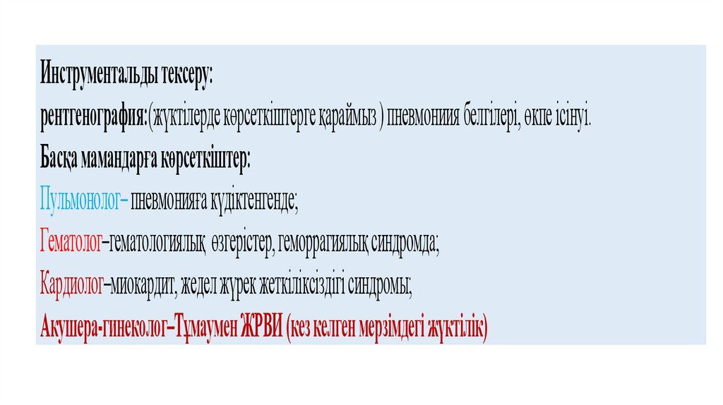 Инструментальды тексеру:рентгенография:(жүктілерде көрсеткіштерге қараймыз ) пневмониия белгілері, өкпе ісінуі.