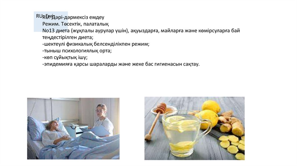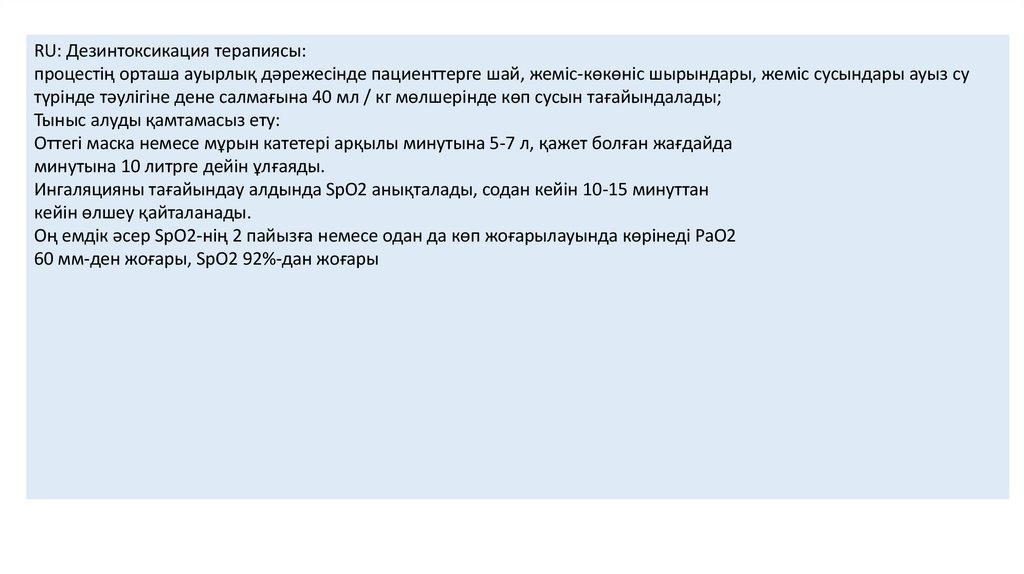 RU: Дезинтоксикация терапиясы:процестің орташа ауырлық дәрежесінде пациенттерге шай, жеміс-көкөніс шырындары, жеміс сусындары ауыз су