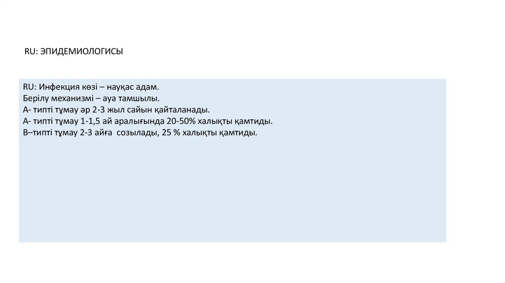 RU: ЭПИДЕМИОЛОГИСЫRU: Инфекция көзі – науқас адам.