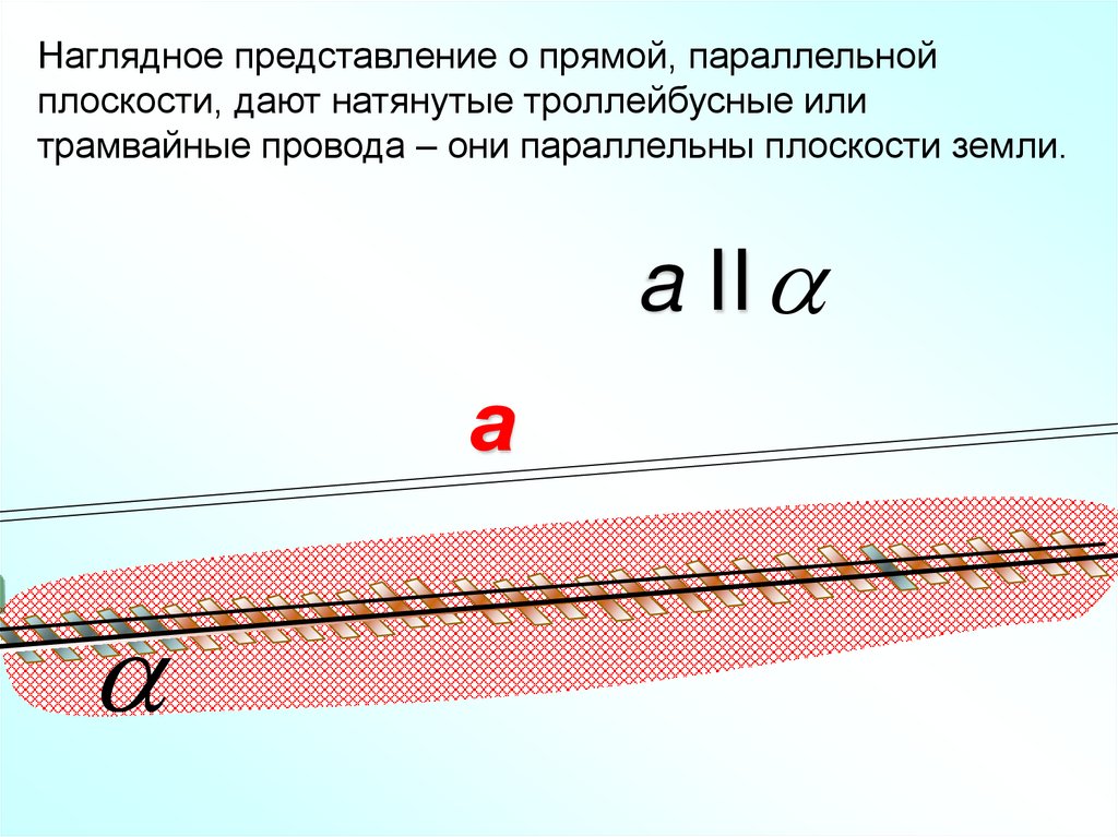 Наглядное представление о прямой, параллельнойплоскости, дают натянутые троллейбусные или