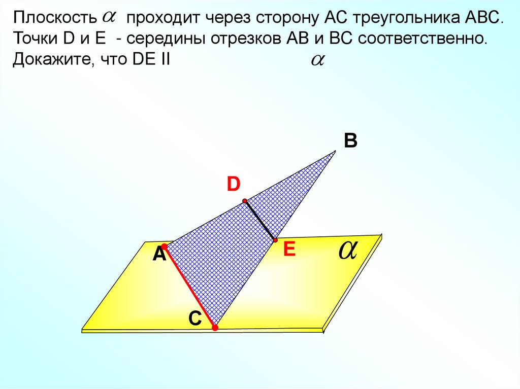 Плоскость проходит через сторону АС треугольника АВС.Точки D и E - середины отрезков АВ и BC соответственно.