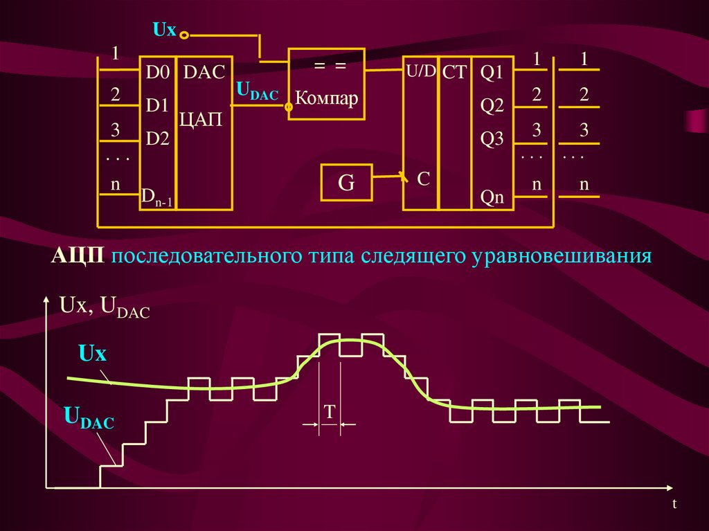 Алгоритм работы этой схемы аналогичен АЦП последовательного типа развертывающего уравновешивания. Поэтомуоба преобразователя могут использоваться для преобразования