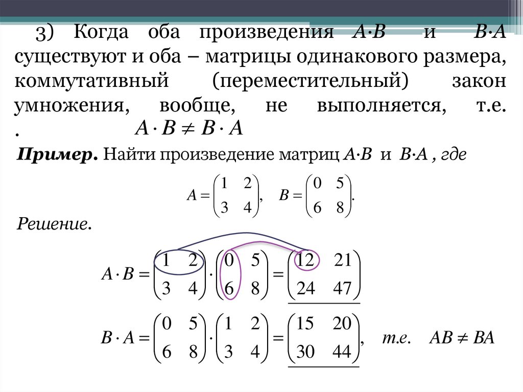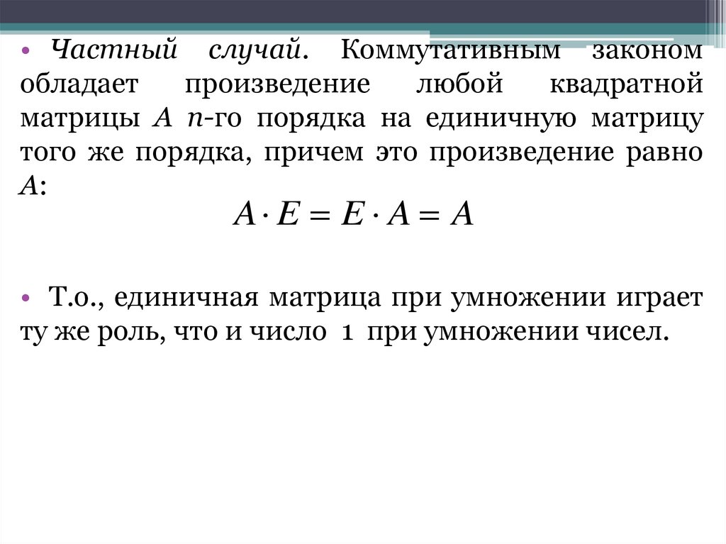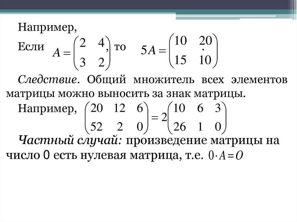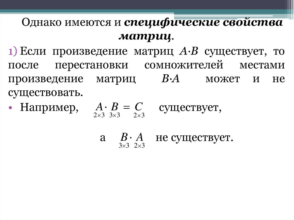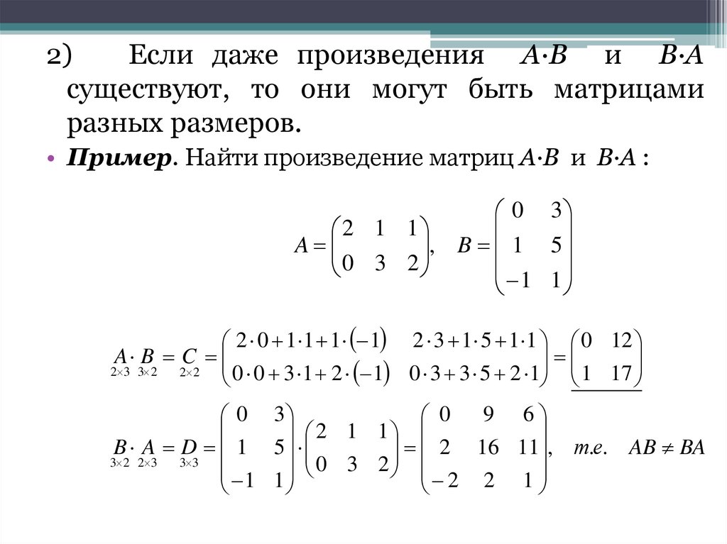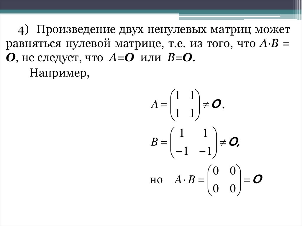4) Произведение двух ненулевых матриц можетравняться нулевой матрице, т.е. из того, что А·В =