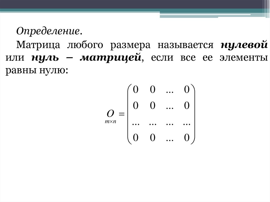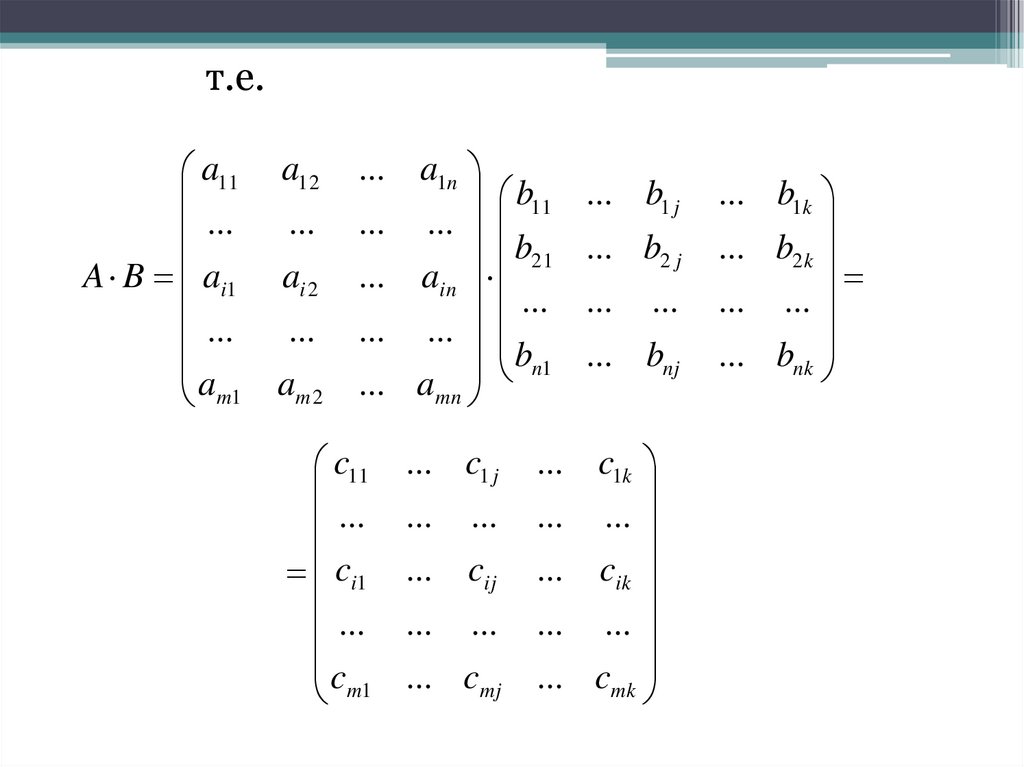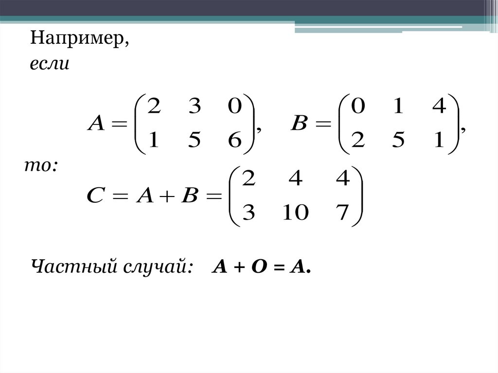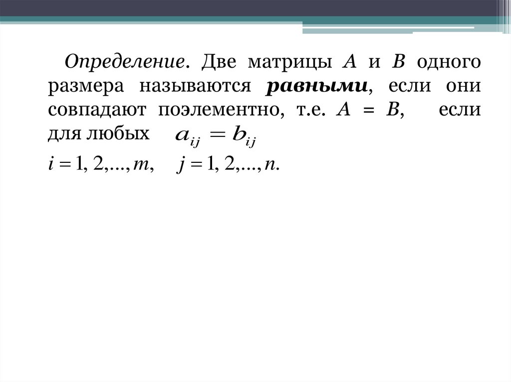 Определение. Две матрицы А и В одногоразмера называются равными, если они