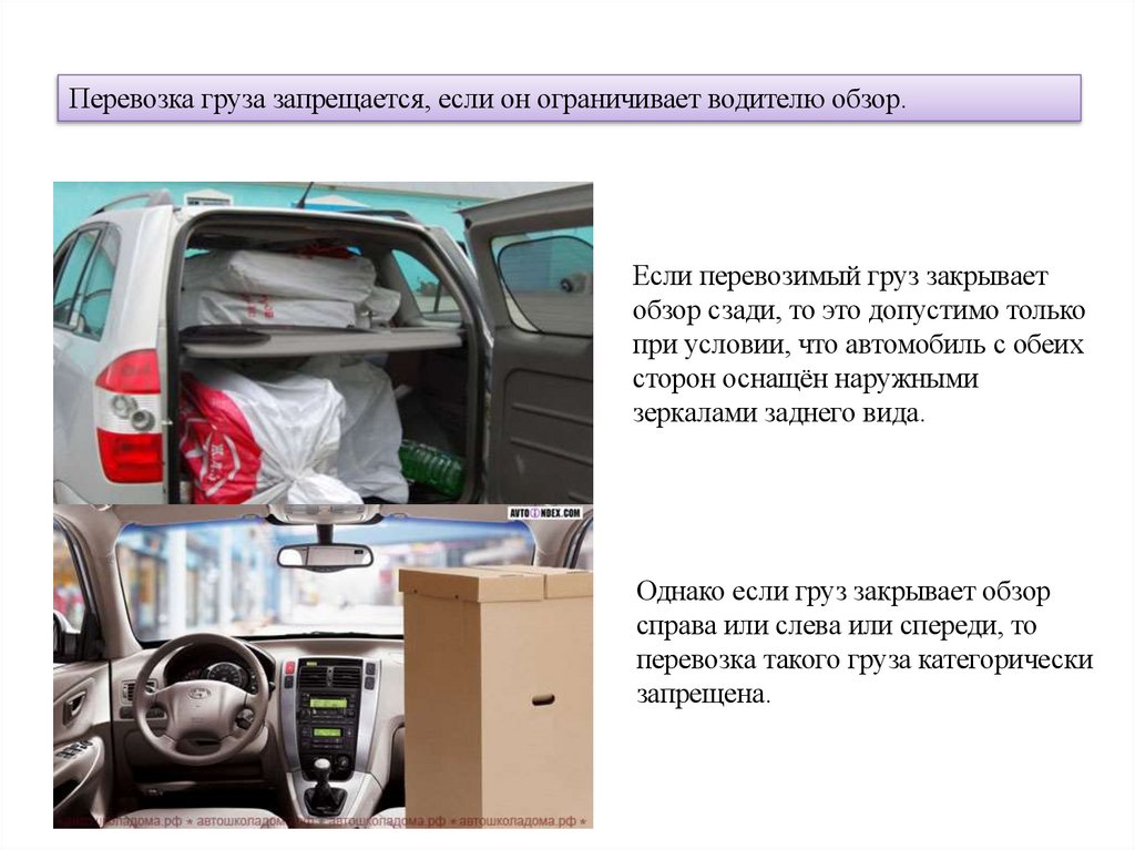 Перевозка груза запрещается, если он ограничивает водителю обзор.Если перевозимый груз закрывает