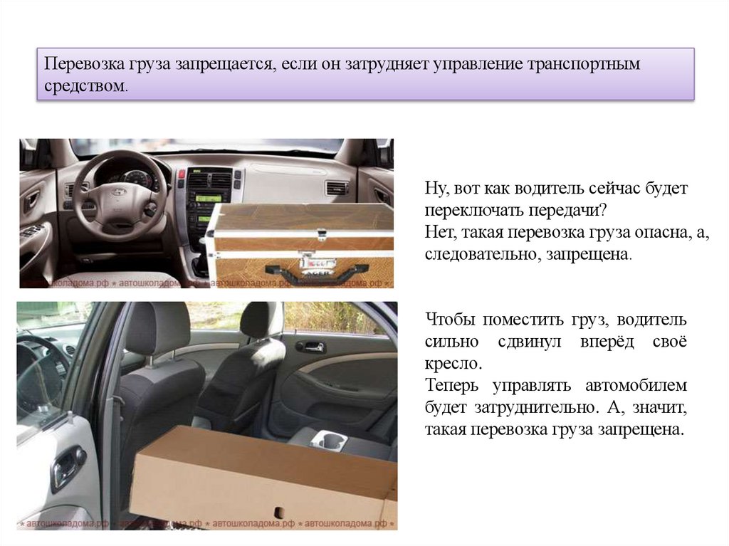 Перевозка груза запрещается, если он затрудняет управление транспортнымсредством.