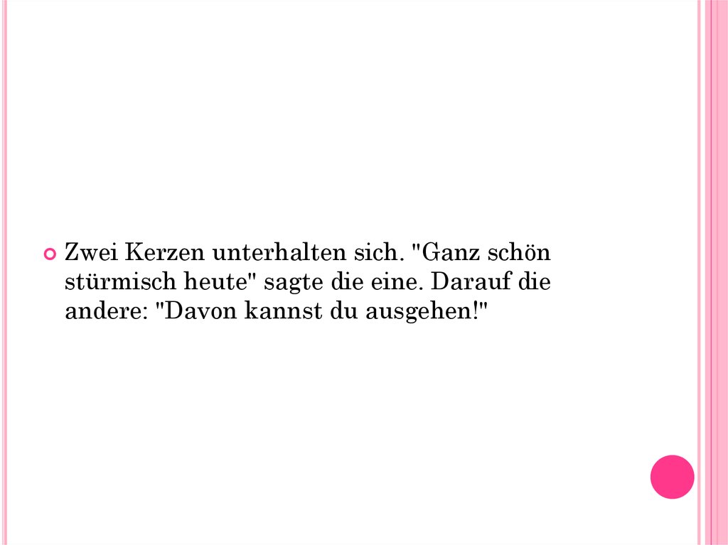 Zwei Kerzen unterhalten sich. "Ganz schönstürmisch heute" sagte die eine. Darauf die