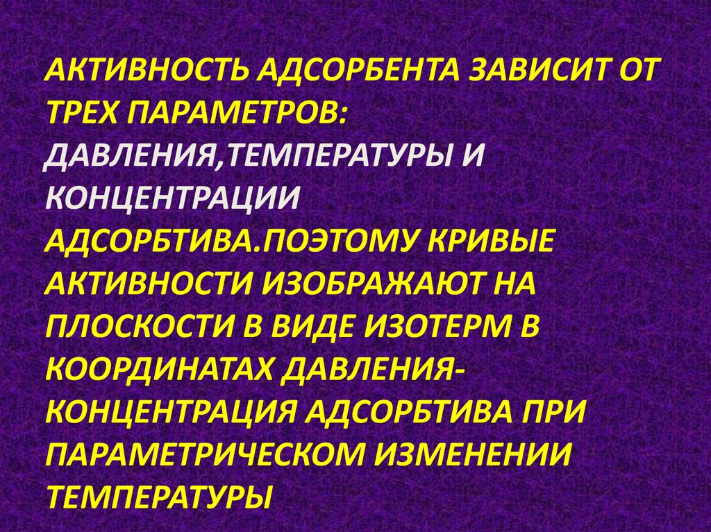 АКТИВНОСТЬ АДСОРБЕНТА ЗАВИСИТ ОТТРЕХ ПАРАМЕТРОВ: