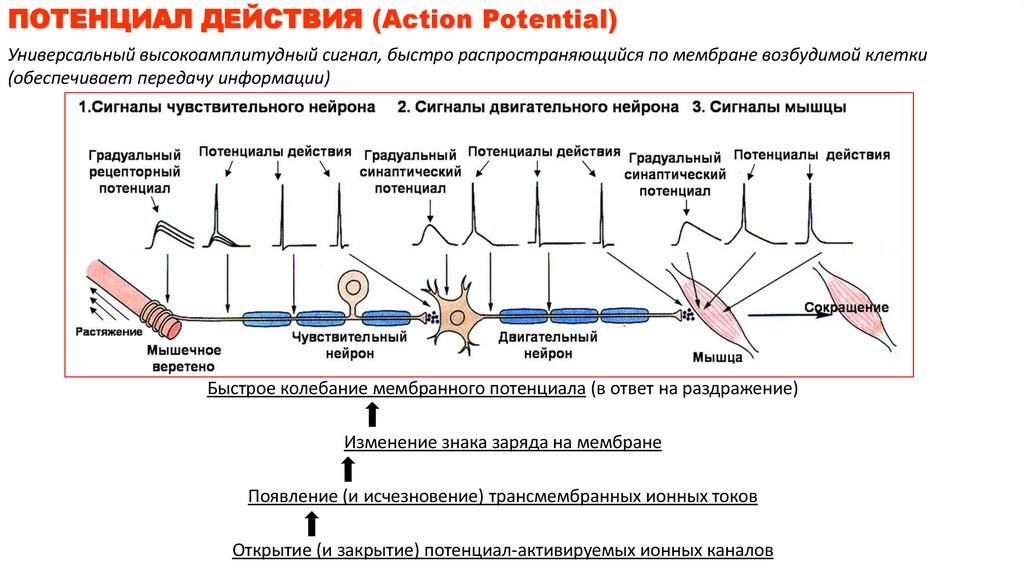 ПОТЕНЦИАЛ ДЕЙСТВИЯ (Action Potential)Универсальный высокоамплитудный сигнал, быстро распространяющийся по мембране возбудимой клетки