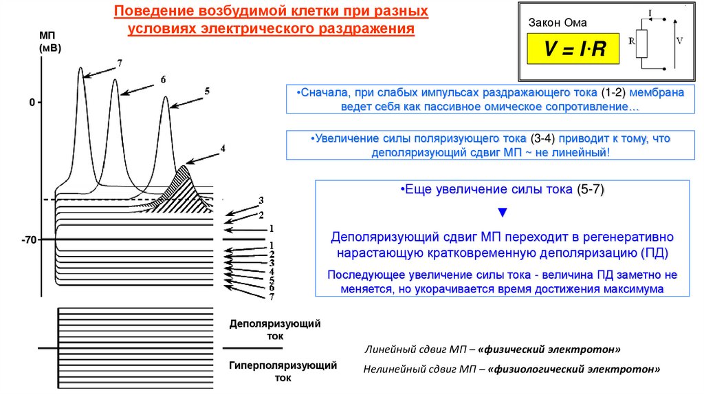 •Сначала, при слабых импульсах раздражающего тока (1-2) мембрана