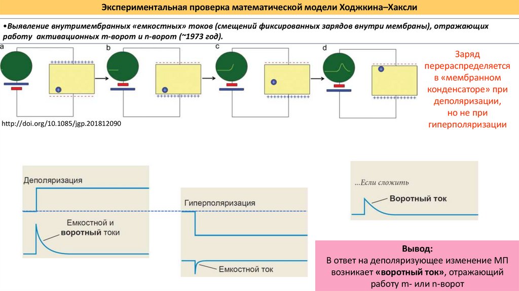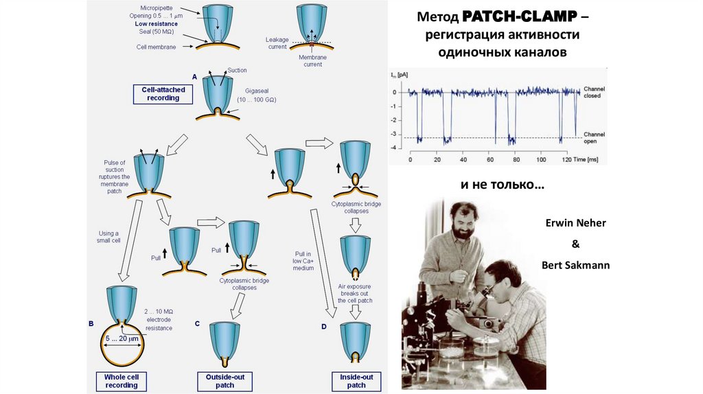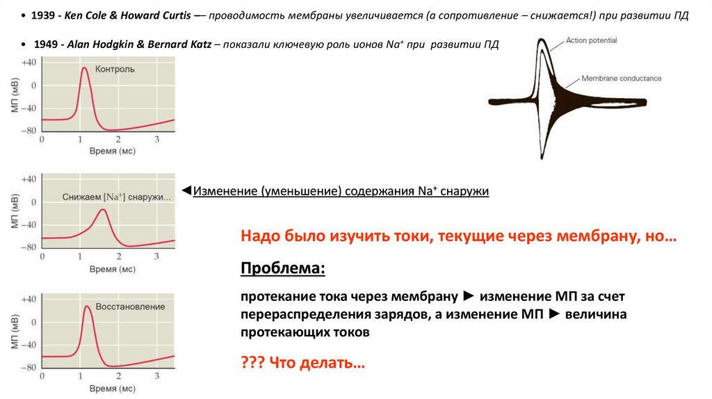 • 1939 - Ken Cole & Howard Curtis –– проводимость мембраны увеличивается (а сопротивление – снижается!) при развитии ПД• 1949 - Alan Hodgkin & Bernard Katz – показали ключевую роль ионов Na+ при развитии ПД