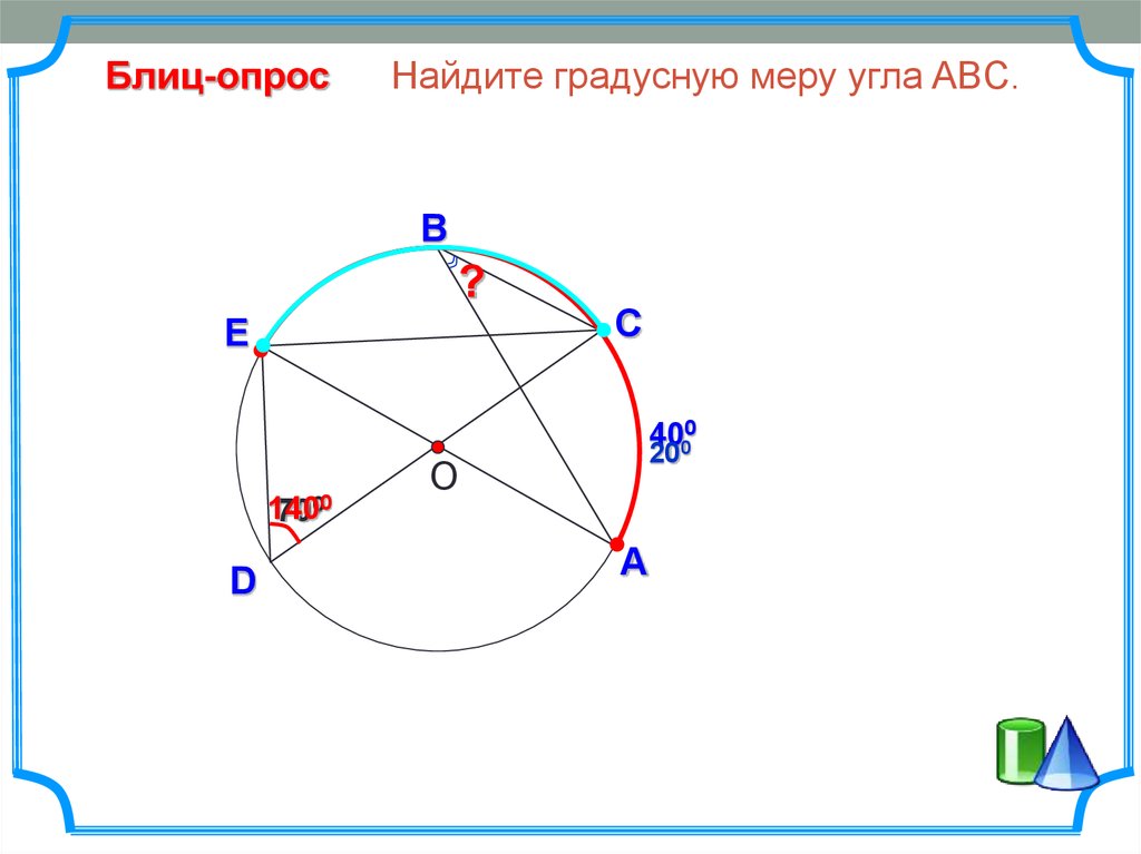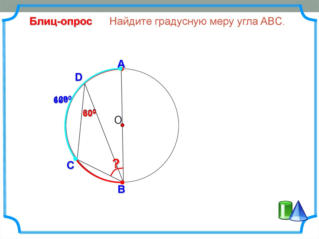 Блиц-опросНайдите градусную меру угла ABC.