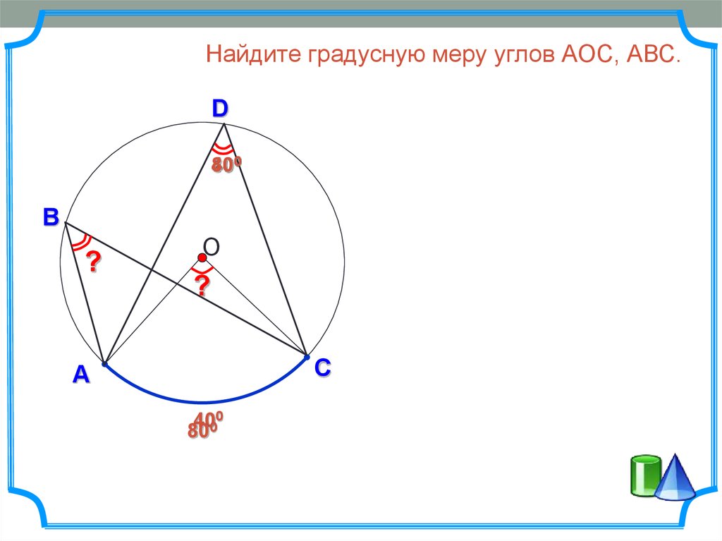 Найдите градусную меру углов АОC, АВС.D