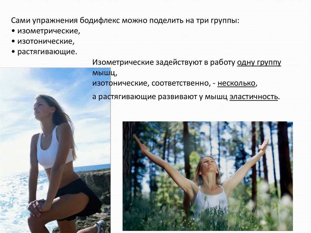 Сами упражнения бодифлекс можно поделить на три группы:• изометрические,