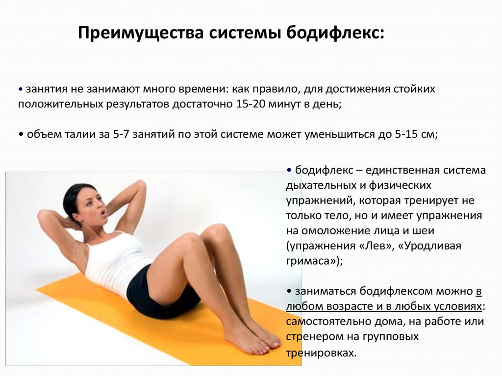 Преимущества системы бодифлекс:• занятия не занимают много времени: как правило, для достижения стойких