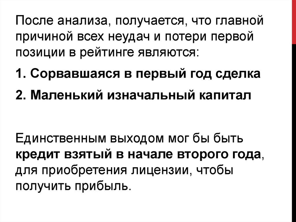 После анализа, получается, что главнойпричиной всех неудач и потери первой