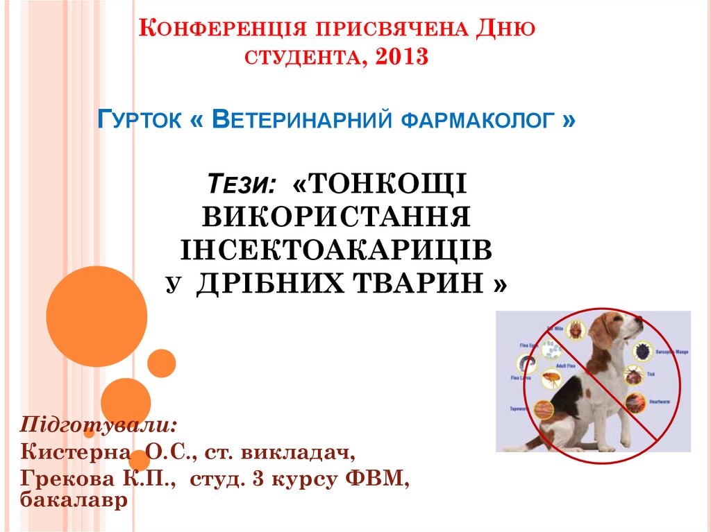 1. Конференція присвячена Дню студента, 2013 Гурток « Ветеринарний фармаколог » Тези: «ТОНКОЩІ ВИКОРИСТАННЯ ІНСЕКТОАКАРИЦІВ у ДРІБНИХ ТВАРИН »