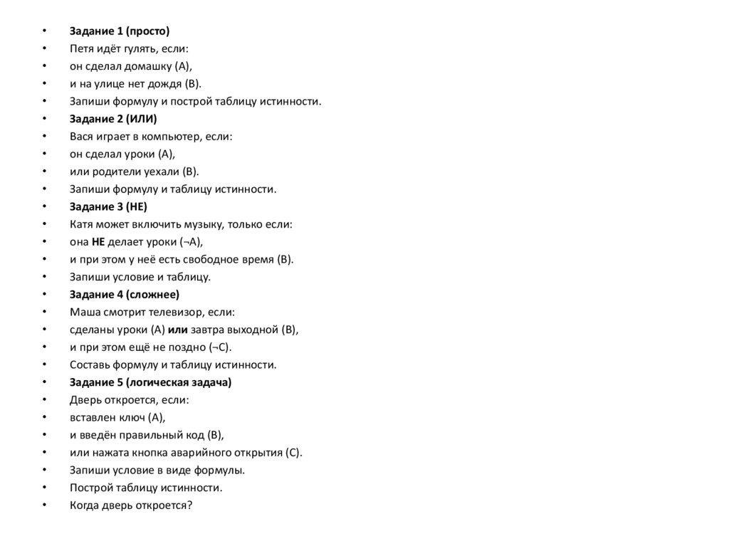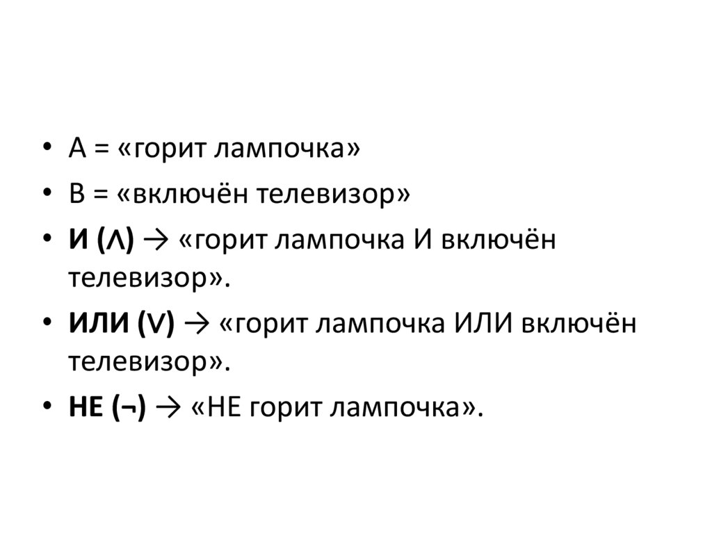 • ИЛИ (∨) → «горит лампочка ИЛИ включён