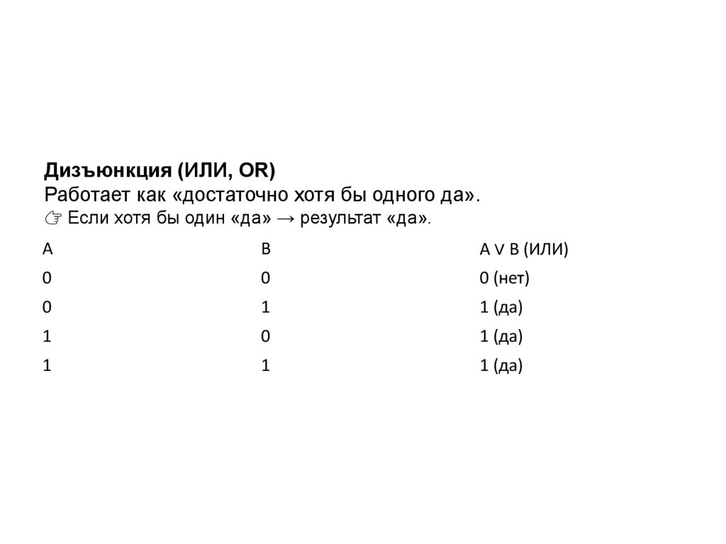 Дизъюнкция (ИЛИ, OR)Работает как «достаточно хотя бы одного да».