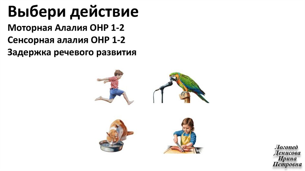 ВЫБЕРИ ДЕЙСТВИЕ. Рисунок на белом фоне. Моторная Алалия ОНР1-ОНР2. Сенсорная алалия ОНР1-ОНР2. ЗРР