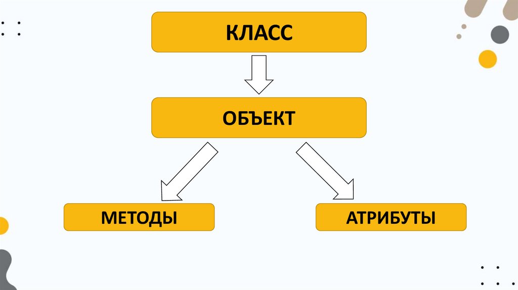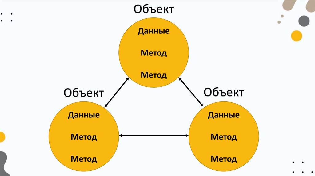 1. Объект. Часть кода, которая описывает элемент с конкретнымихарактеристиками и функциями. Карточка товара в каталоге интернетмагазина — это объект. Кнопка «заказать» — тоже.