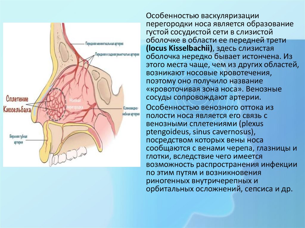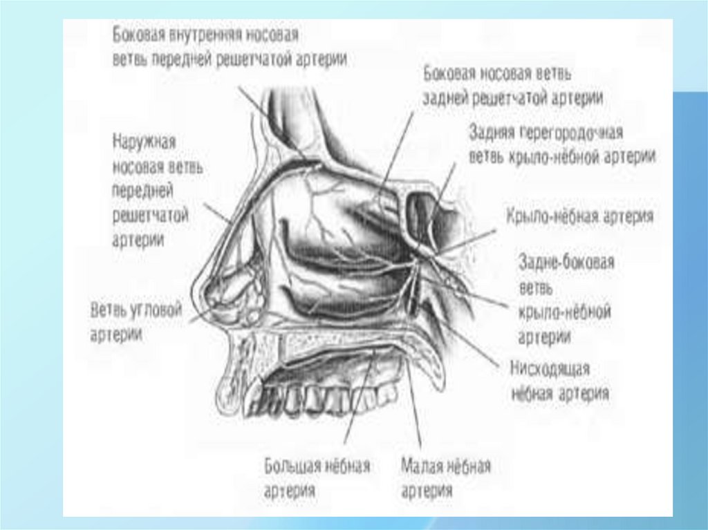 Наружный нос, как и все мягкие ткани лица,характеризуется обильным кровоснабжением: к