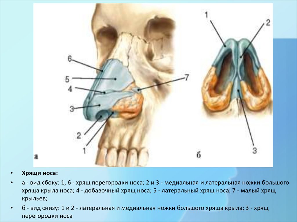 а - вид сбоку: 1, 6 - хрящ перегородки носа; 2 и 3 - медиальная и латеральная ножки большого