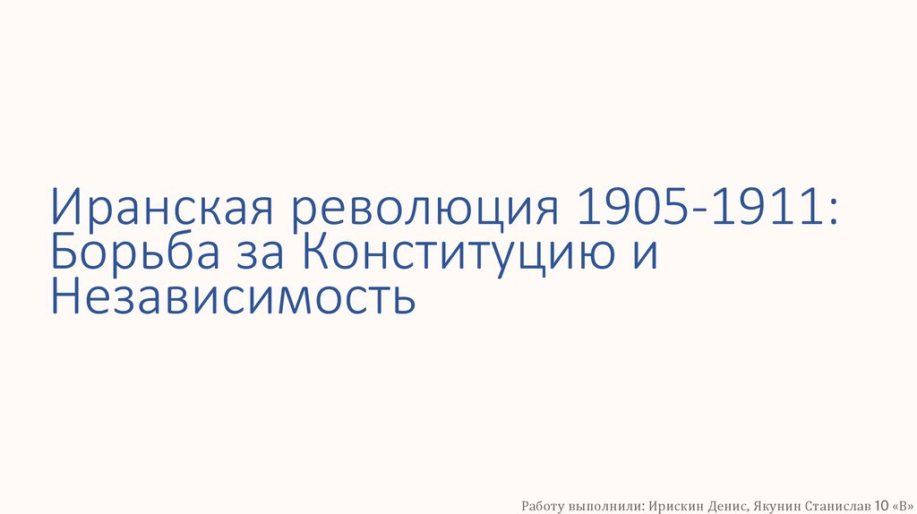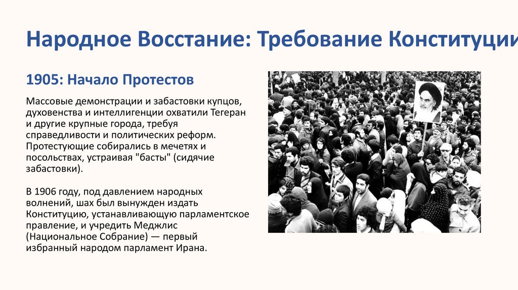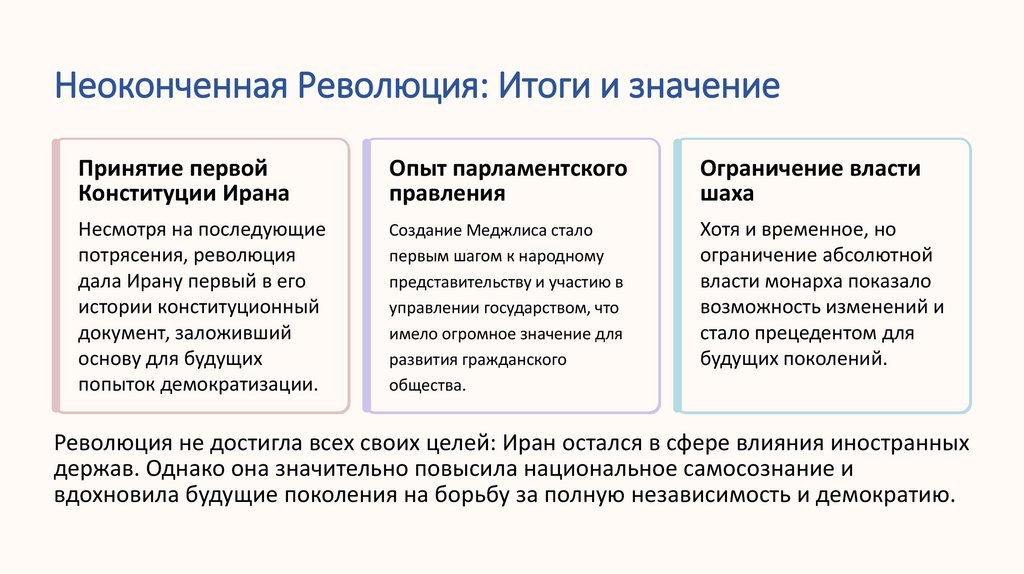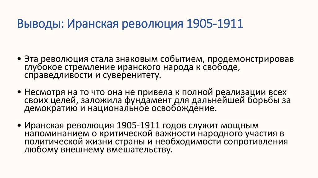 Выводы: Иранская революция 1905-1911• Эта революция стала знаковым событием, продемонстрировав