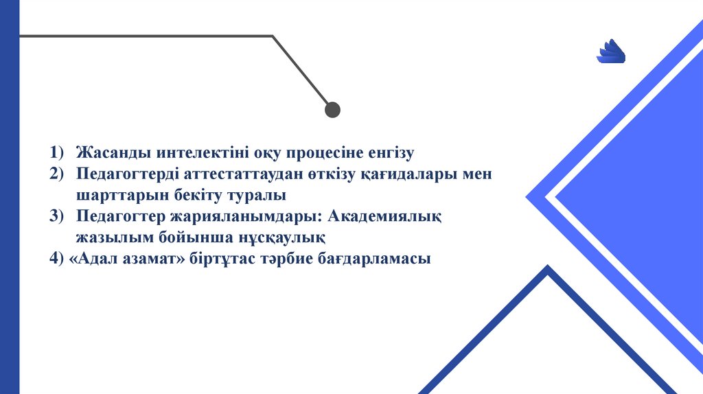 1) Жасанды интелектіні оқу процесіне енгізу2) Педагогтерді аттестаттаудан өткізу қағидалары мен