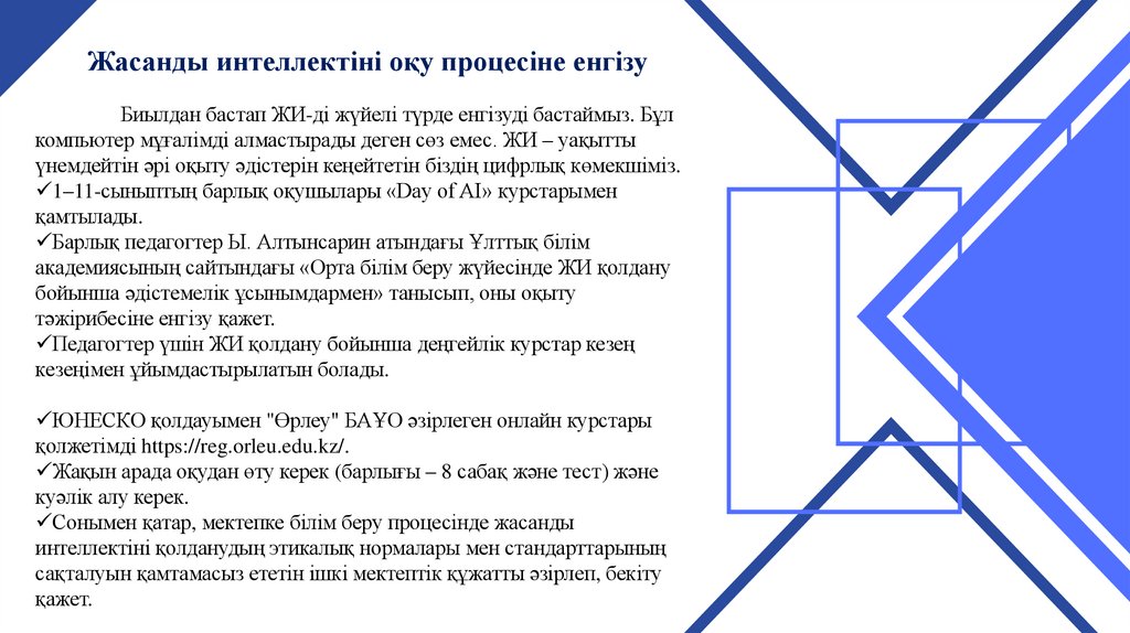 Жасанды интеллектіні оқу процесіне енгізуБиылдан бастап ЖИ-ді жүйелі түрде енгізуді бастаймыз. Бұл