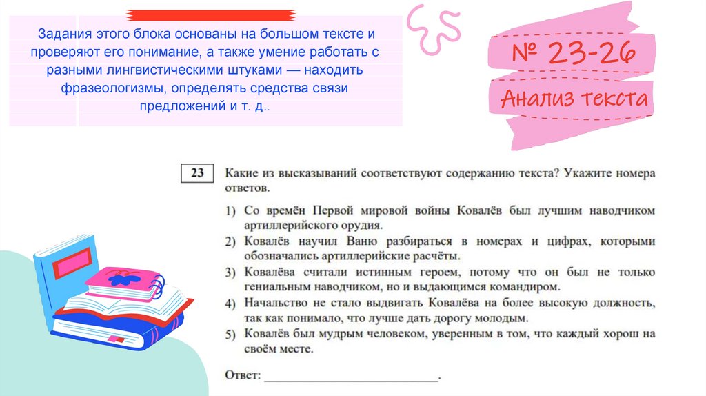 Задания этого блока основаны на большом тексте ипроверяют его понимание, а также умение работать с