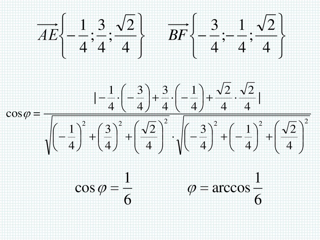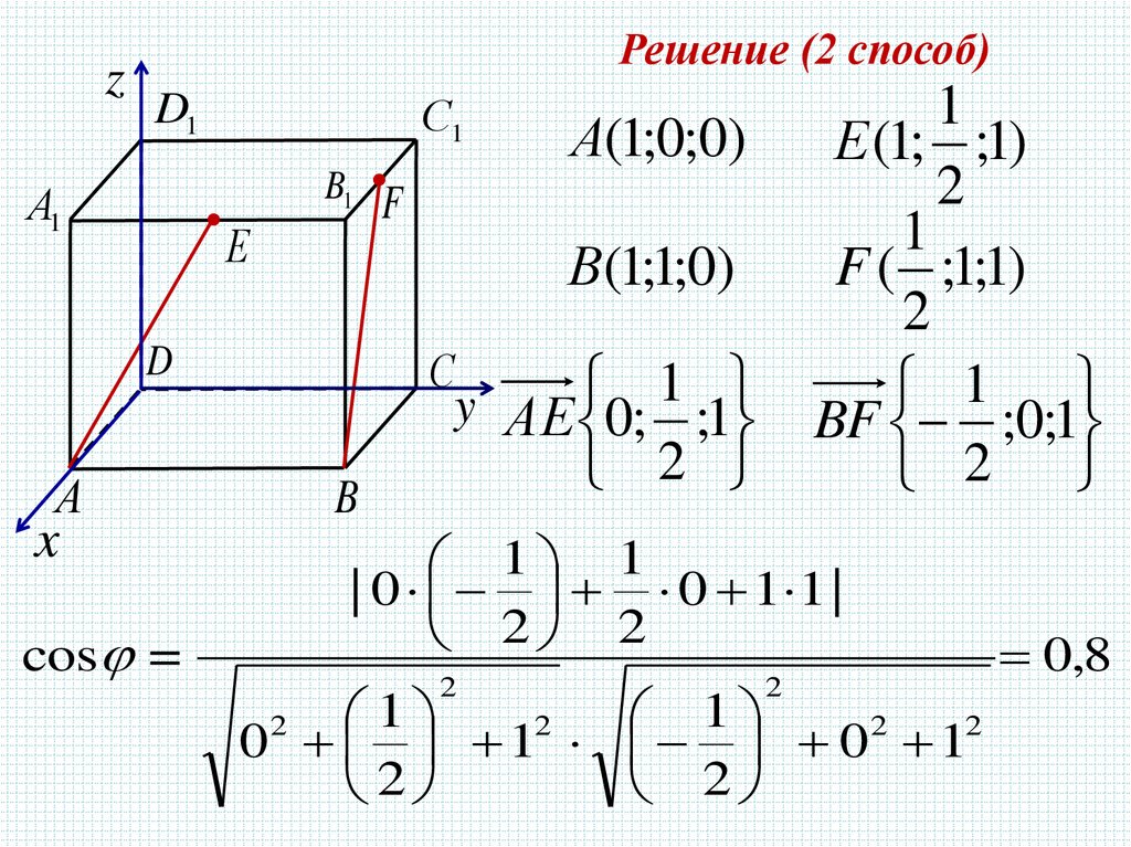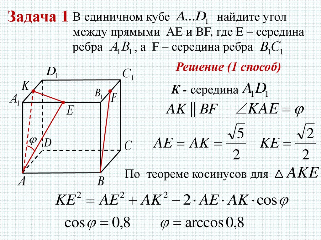 Задача 1 В единичном кубе A...D1 найдите уголмежду прямыми AE и BF, где Е – середина