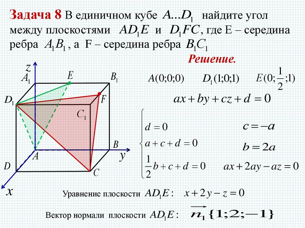 Задача 8 В единичном кубе A...D1 найдите уголмежду плоскостями AD1 E и D1FC , где Е – середина
